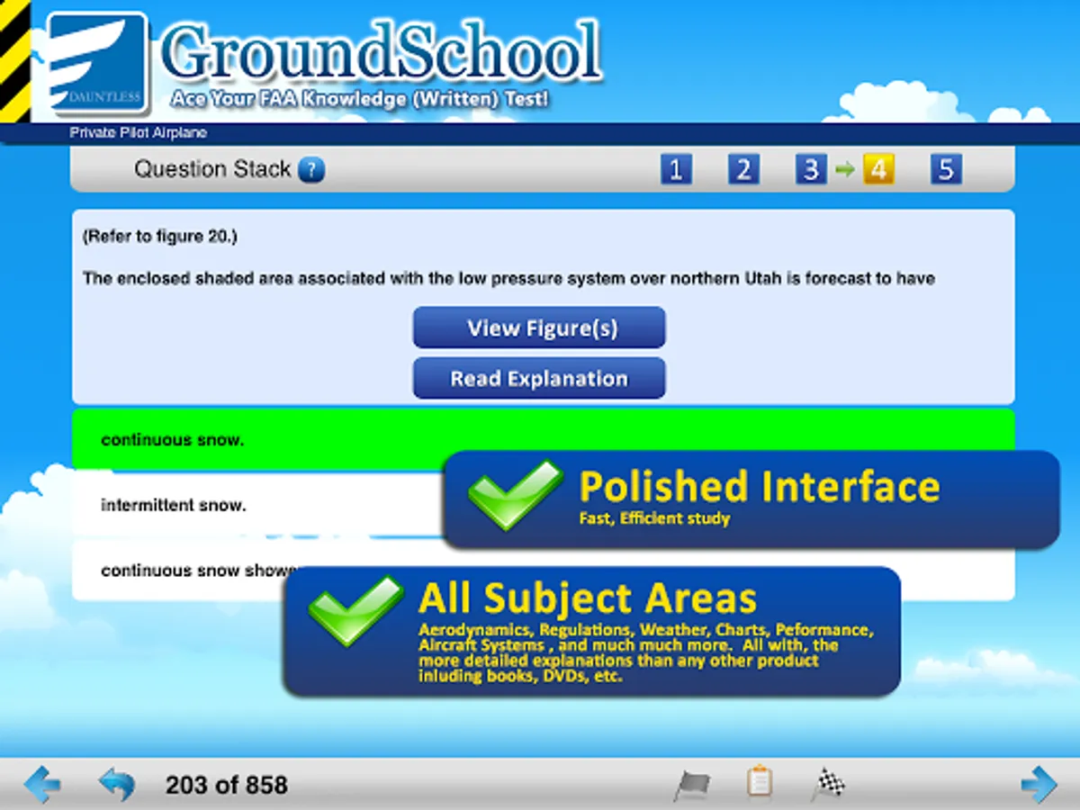 Study actual, up-to-date FAA questions and then ACE your FAA Private Pilot and/or Recreational Pilot knowledge (written) test the easy way with GroundSchool FAA Knowledge Test Preparation software by Dauntless Aviation, the trusted leader in FAA written test preparation.