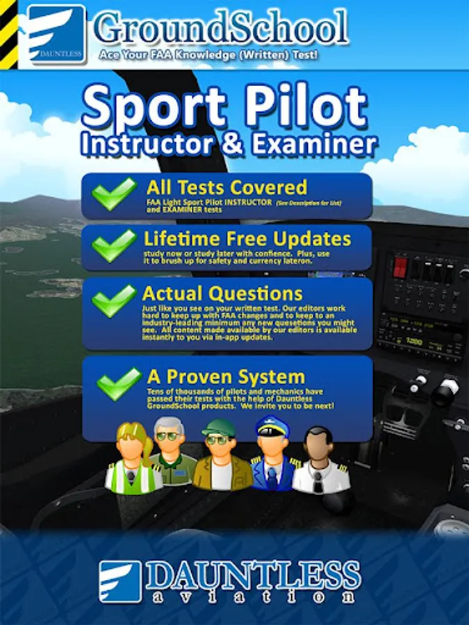 Study actual, up-to-date FAA questions and then ACE your FAA Sport Pilot Instructor/Examiner written test the easy way with GroundSchool FAA Knowledge Test Preparation software by Dauntless Aviation, the trusted leader in FAA written test preparation.