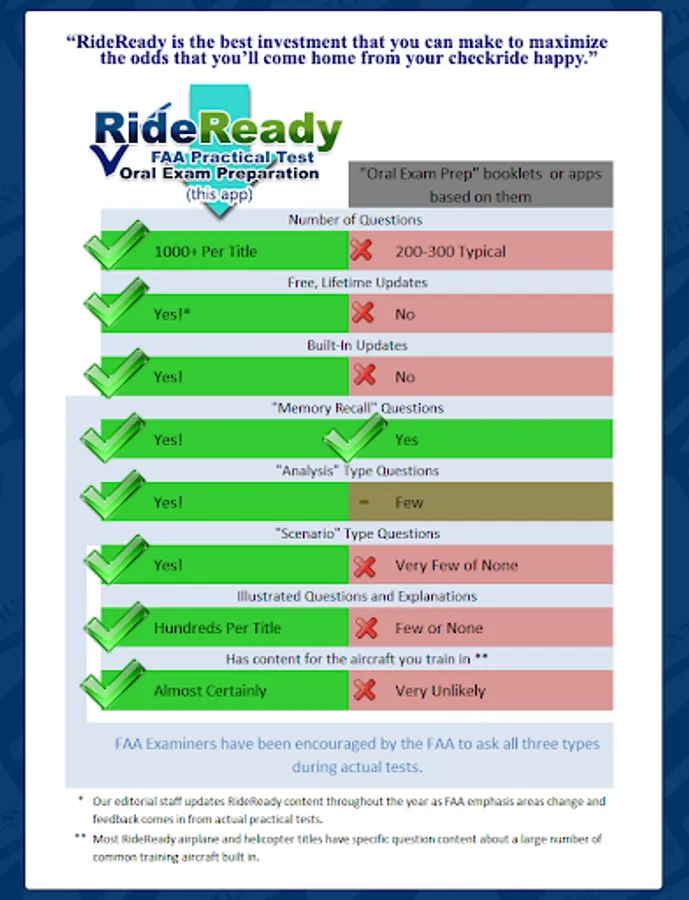 * Thousands of Success Stories - Every year, thousands of pilots use RideReady to learn or brush up the material to make them confident and ready to pass their FAA checkrides. We invite you to be next!