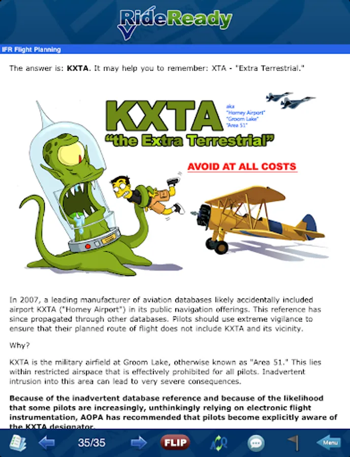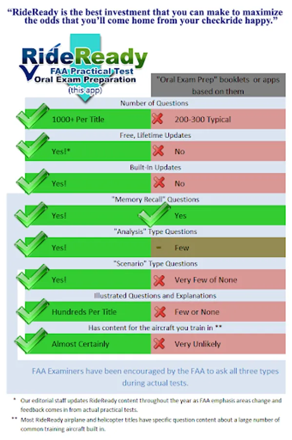 * This is NOT FAA written (knowledge) test preparation. If you want FAA written (knowledge) test preparation, check out our GroundSchool FAA line of products. Many pilots buy both RideReady and our GroundSchool-FAA apps as they work well together.