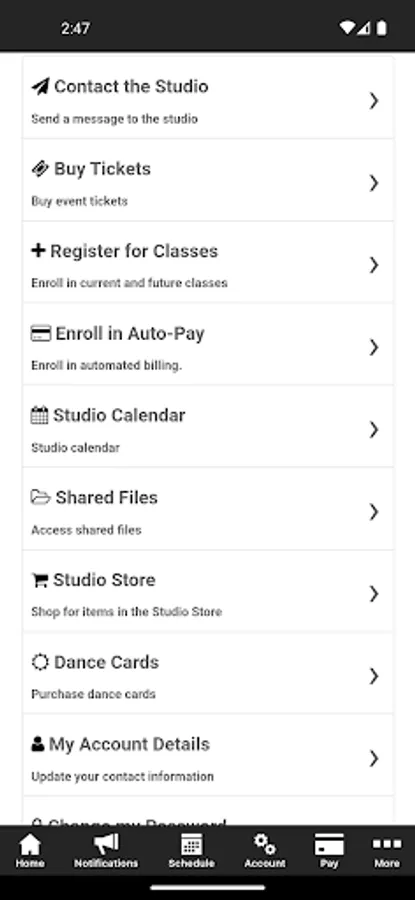 The app makes it easy to receive notifications about auditions, live classes and upcoming events