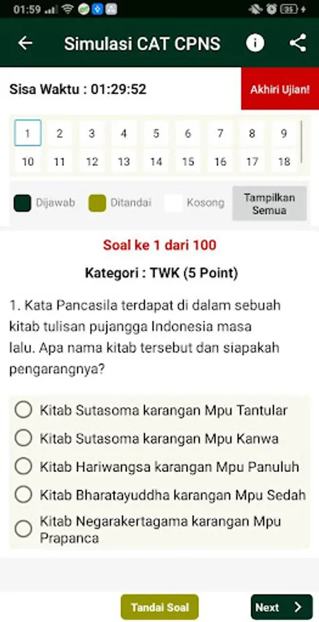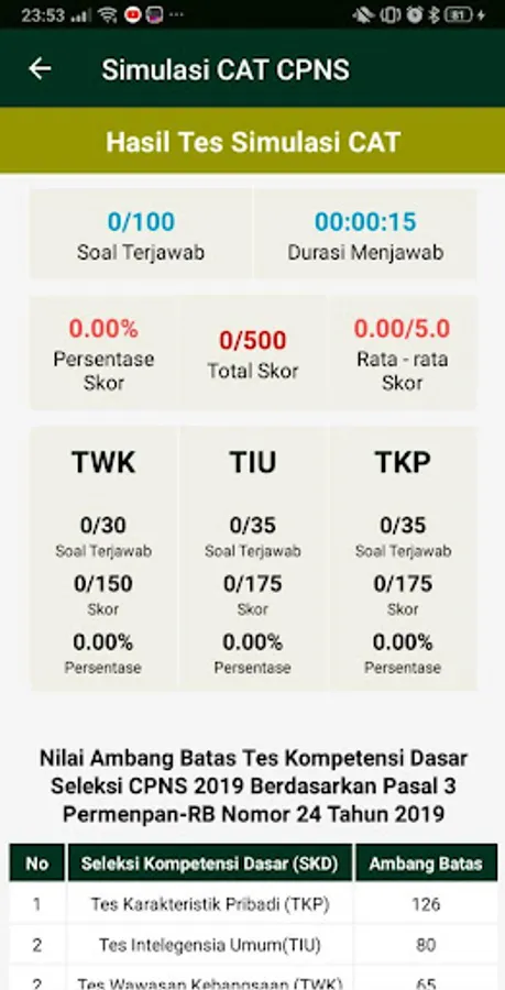 - Complete CPNS Test Simulation 100 questions (TKP, TIU, TWK) with a time of 100 minutes