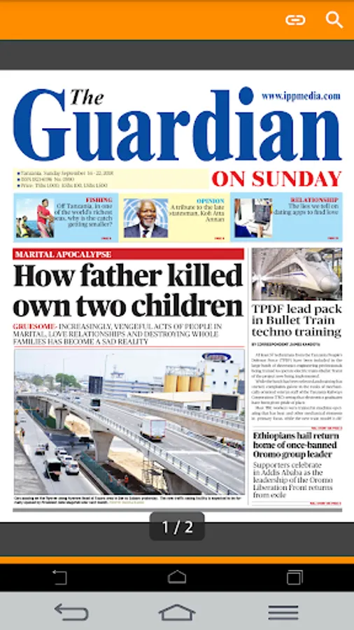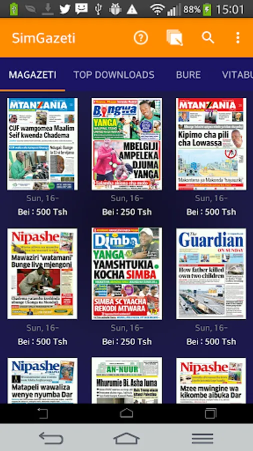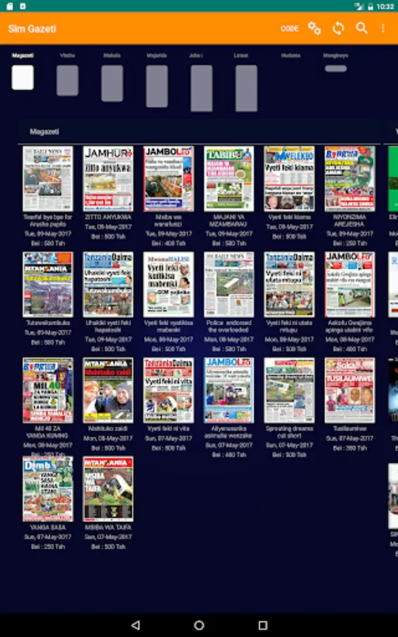 + Newspapers from various publishers such as Mtanzania, Raia Mwema, An-nuur, Rai, Bingwa, Dimba, Mwanasoka, Jambo leo, Majira, Habari leo, Dailynews, spoti leo, Tanzania Daima, uhuru,mwanahalisi and more