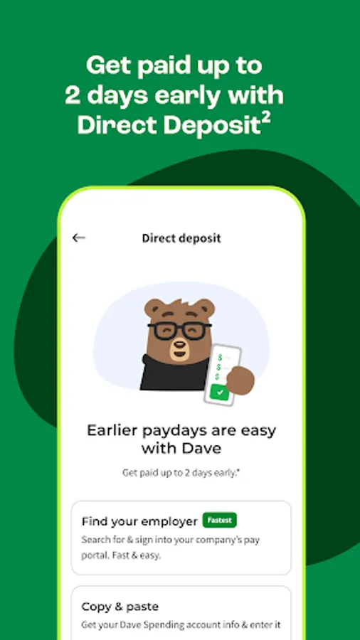 Get paid up to two days early when you set up direct deposit into a Dave Spending account!