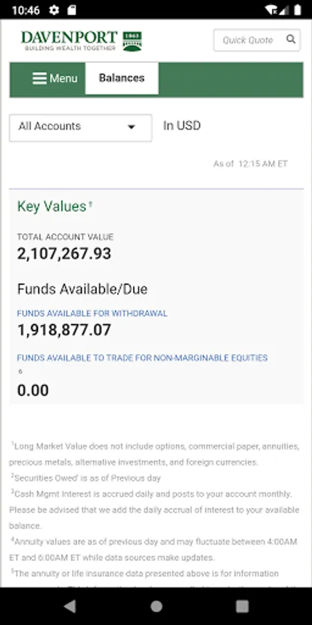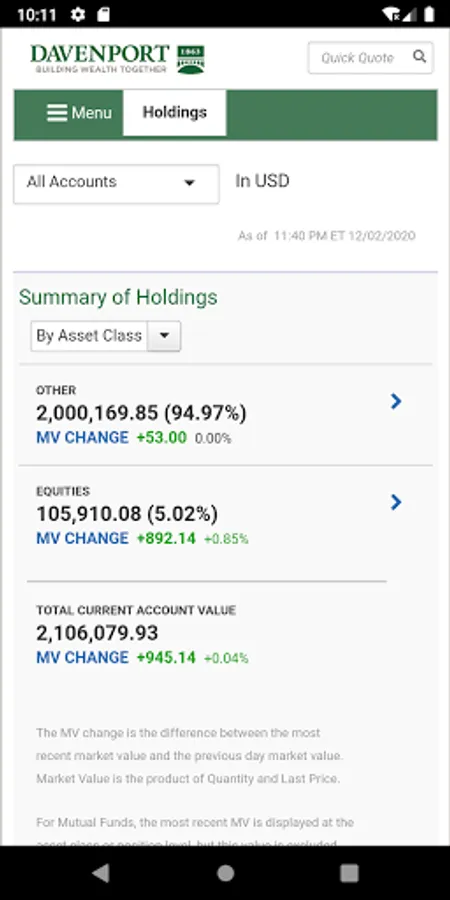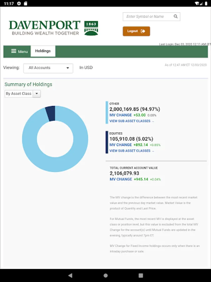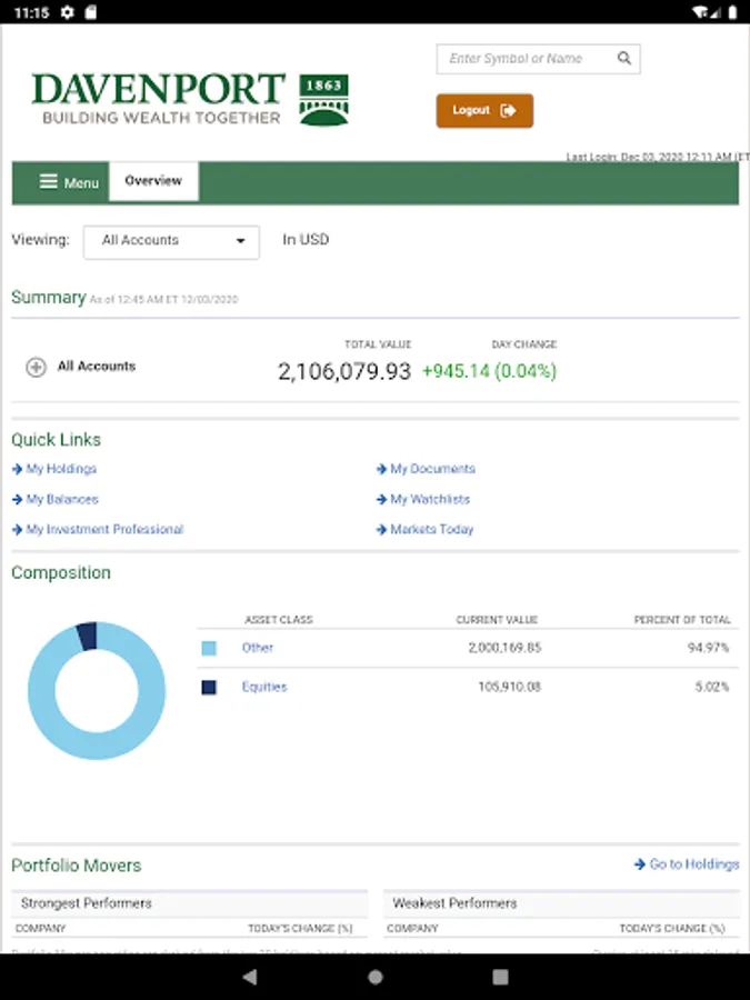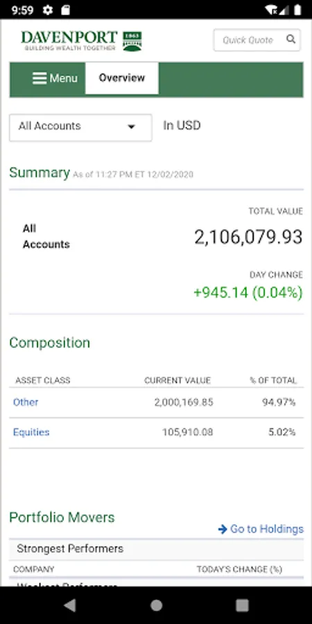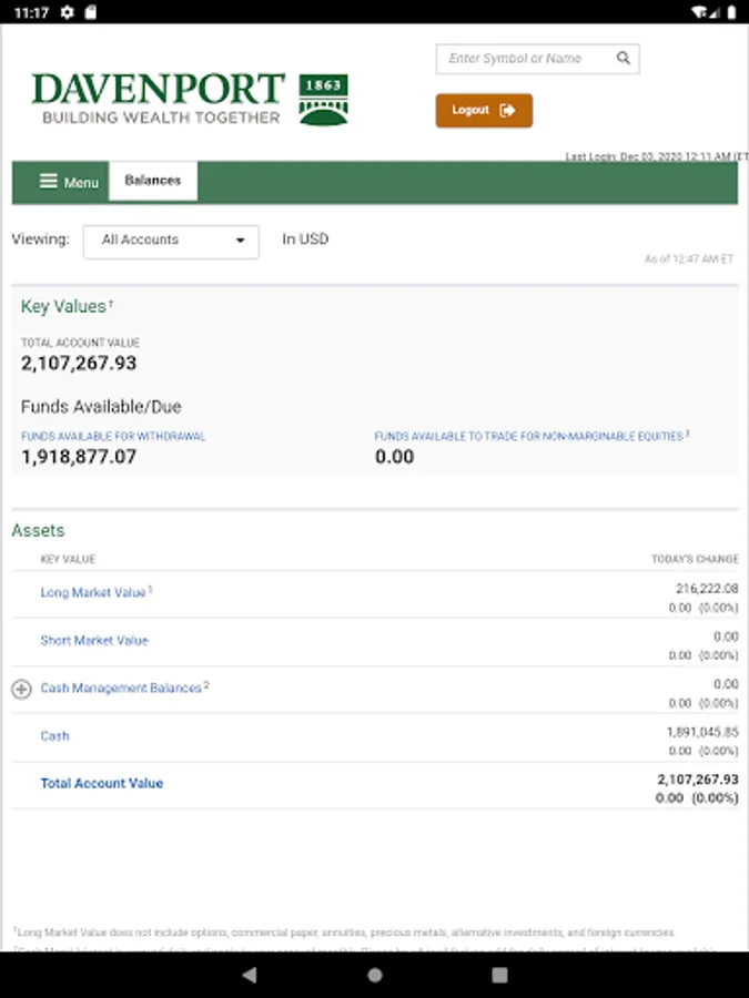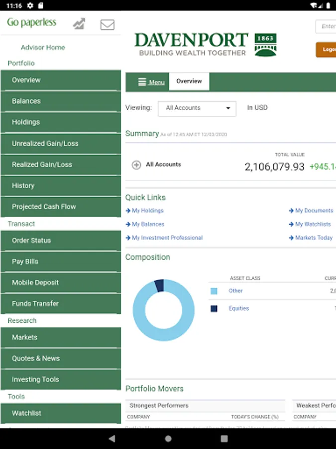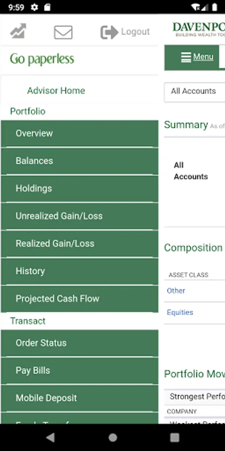 The Davenport & Company Mobile Application is a free app that allows you to monitor your Davenport accounts on a mobile phone or tablet. Davenport Mobile provides anytime, anywhere access your accounts using your Davenport Online login ID and password.