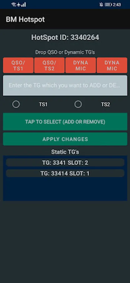 The easiest way to add or remove TG's from your Brandmeister hotspot!!! you can drop your current TS QSO or even Dynamic TG's all within the app!.