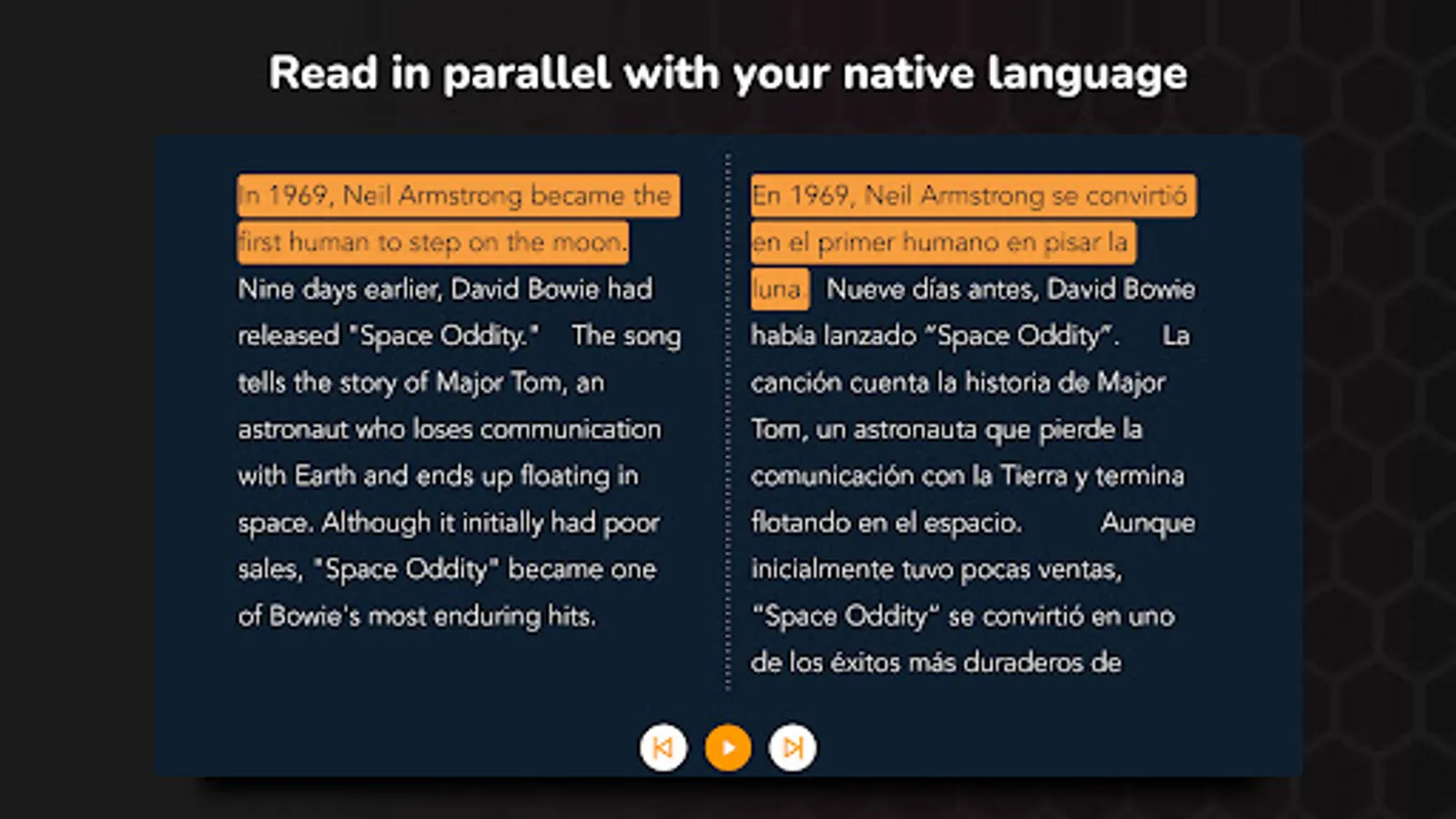 Learn a new language with Beelinguapp, the app where you read stories in different languages side by side. Listen to audio in your target language and read text in both your native and target language as reference.
