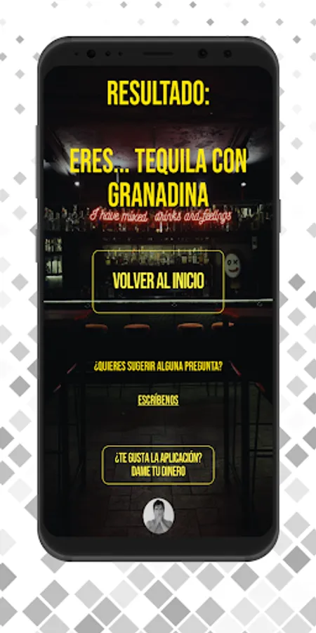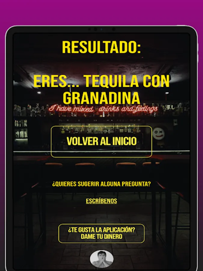 This app will ask you 4 random questions. Depending on your answers, he will suggest a shot.