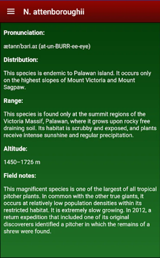 The Nepenthes entries based primarily on data published in peer reviewed research papers, specialist literature relating to the genus, as well as on the general observations of a number of specialists. However, all entries are written in accessible English.