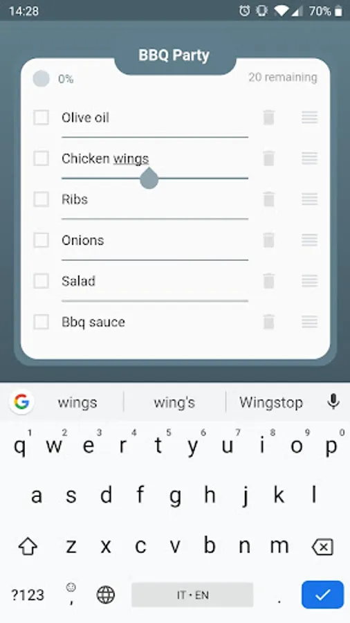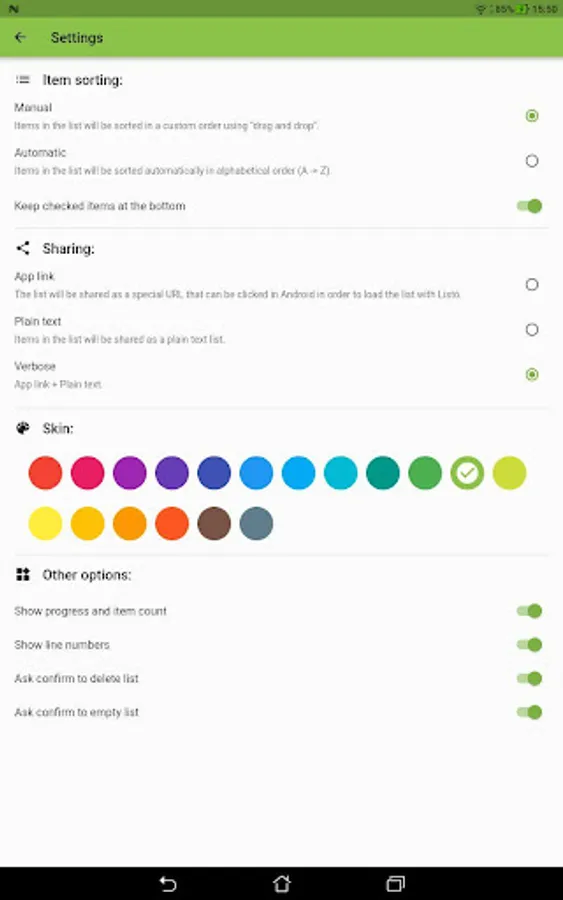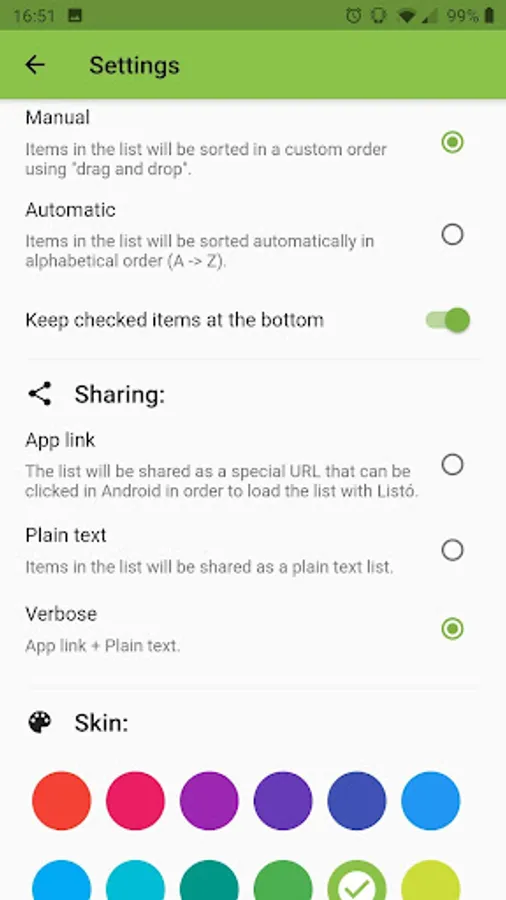 - Sort items in the list manually using "drag and drop" or let the app sort them automatically in alphabetical order (A -> Z)