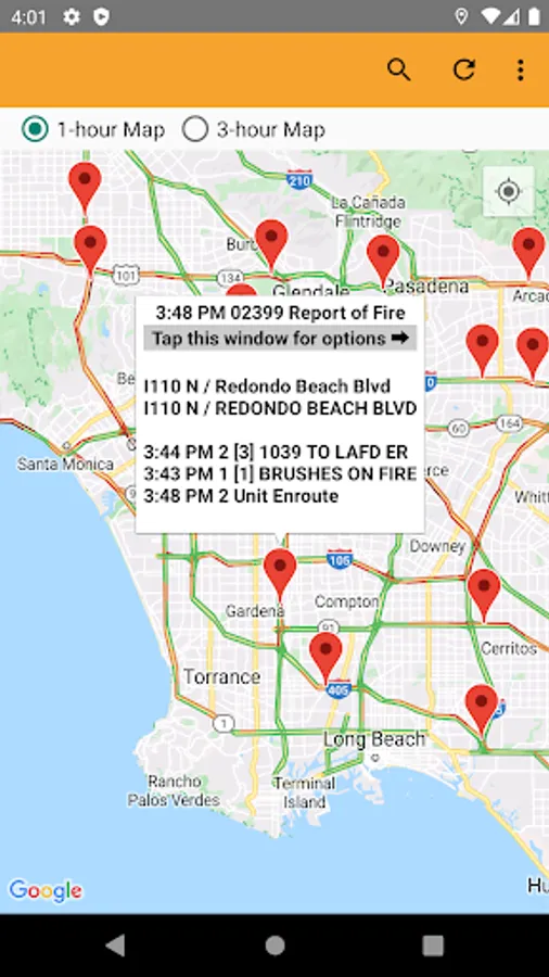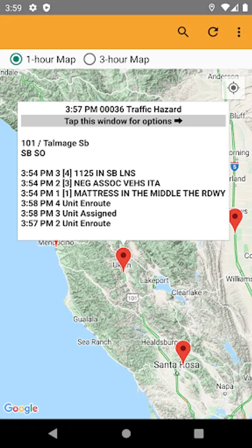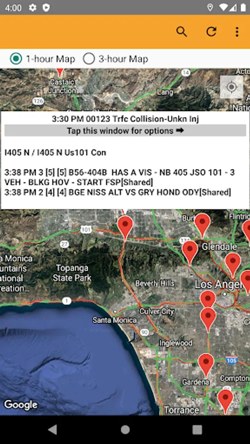 This unofficial app displays a map of traffic incidents, weather, and more reported by CHP. The app is categorized into a past 1-hour incident map and a past 3-hour incident map.