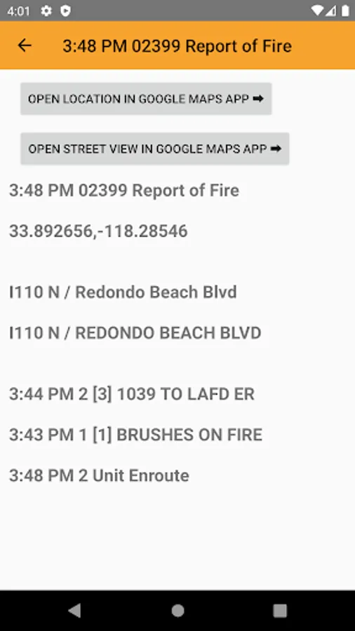 There are deep links to the incident Google Street View and Google Maps app for more analysis.