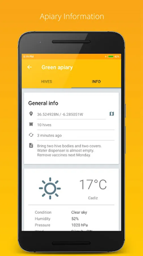 - Get current weather conditions in your apiaries.