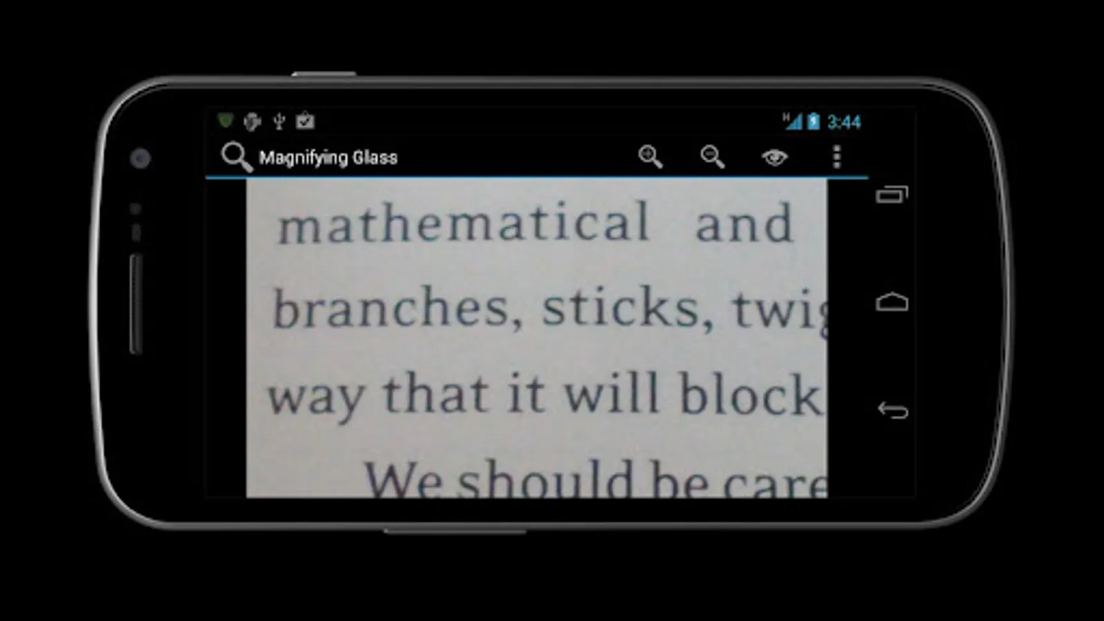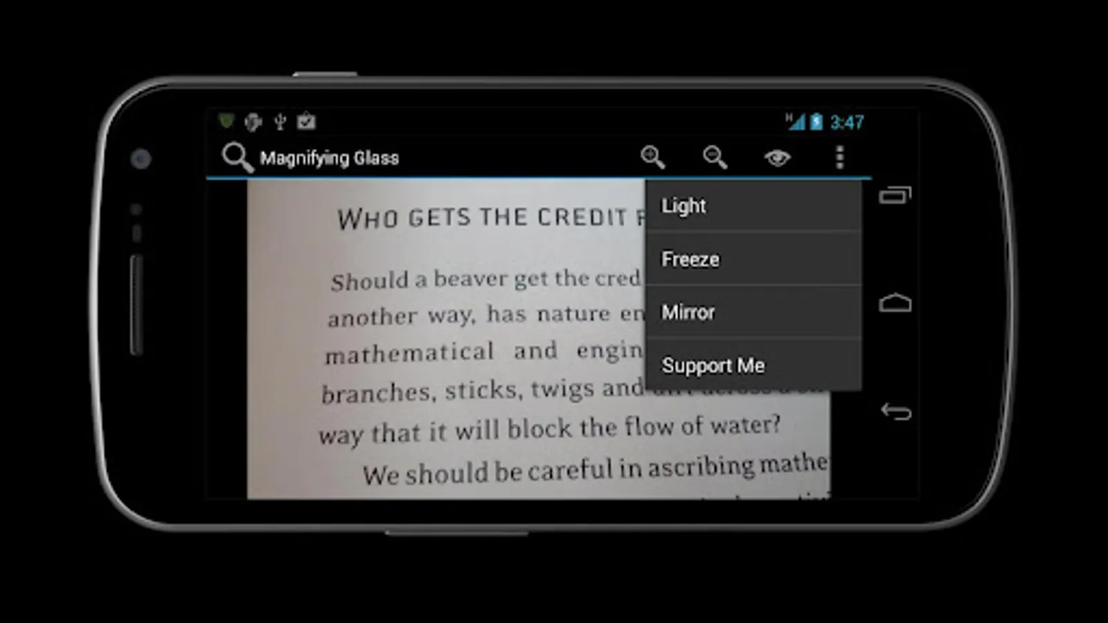 The Magnifying Glass it does what it claims to do - it magnifies what one is looking at through the camera. This simple Magnifying Glass will magnify anything you want just launch it and point at the item. It now will freeze the item you are viewing.