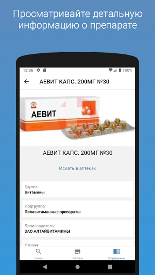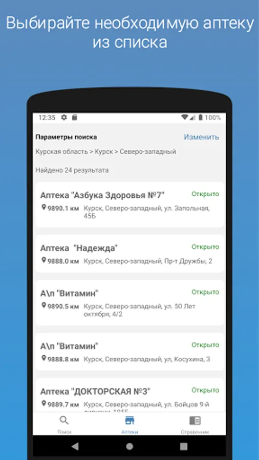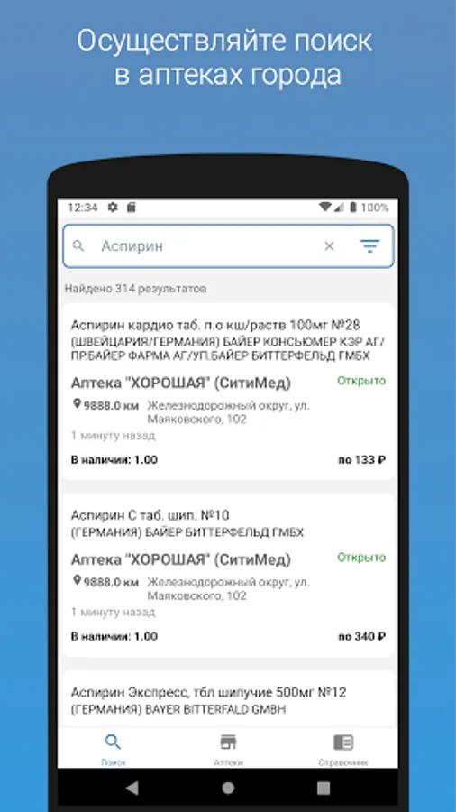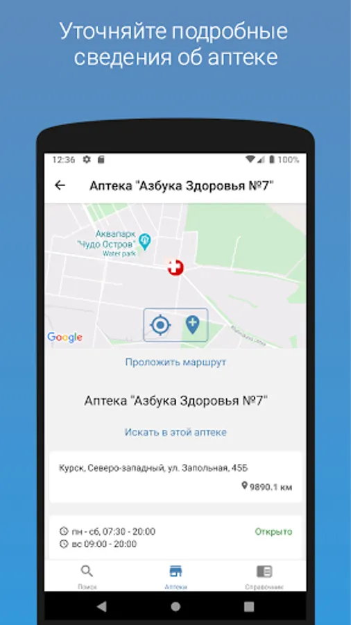 The application will help you find medicines in pharmacies in Kursk and Kursk region at the best price. The search result will be sorted by our unique filter, which takes into account your current location, the price of the medicine and the area of the city, which allows you to find medicines in the nearest pharmacies at the best prices.