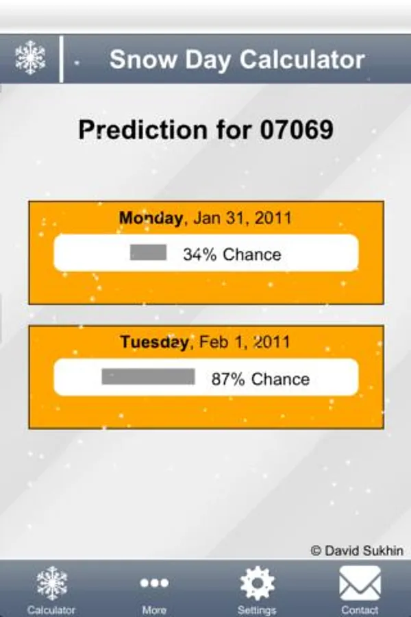 Get the prediction power of the Snow Day Calculator in an App. Using just your zip code, David Sukhin's famous Snow Day Calculator will predict the chance of a snow day.