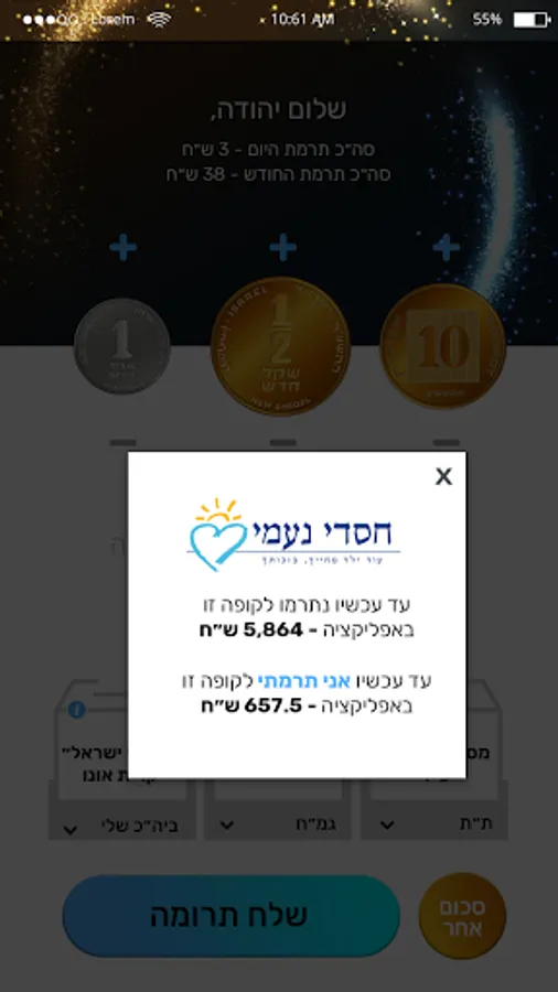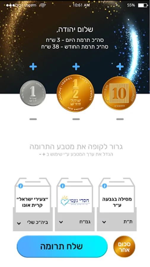 Want to donate regularly? Did you pledge a donation to a synagogue? Whatever the reason, transferring donations has never been so easy and simple. Download the app, choose an organization or association you want to donate to, determine the amount of the donation and send money directly from your credit card. You can donate to several charities daily and even several times a day without restriction. At the end of the month the cumulative monthly amount goes down from your credit card. You will be able to see the details of the charges on the card.