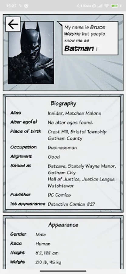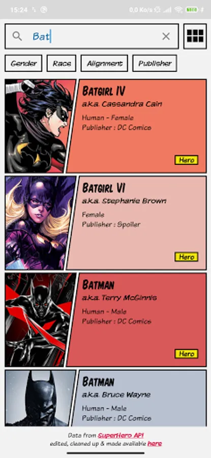 DataHero is an application where you can find a detailed list of all superheroes from different publishers.