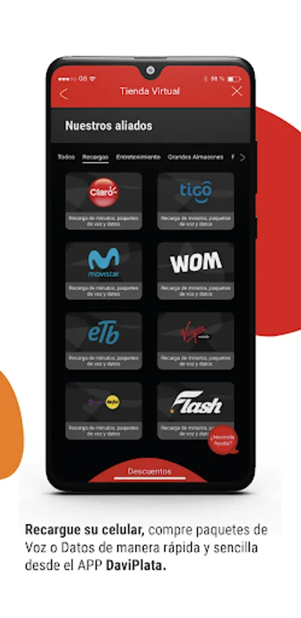 -Recharge your cell phone with minutes or data packages for operators such as Claro, Movistar, Tigo, WOM, ETB, Virgin, Exito and Flash Mobile.