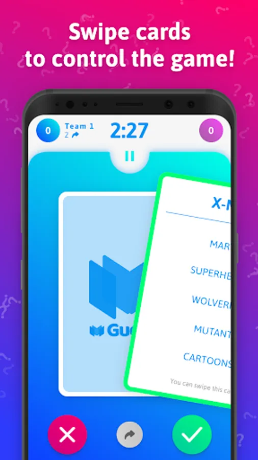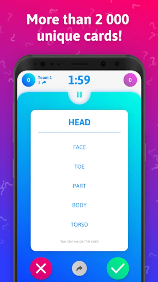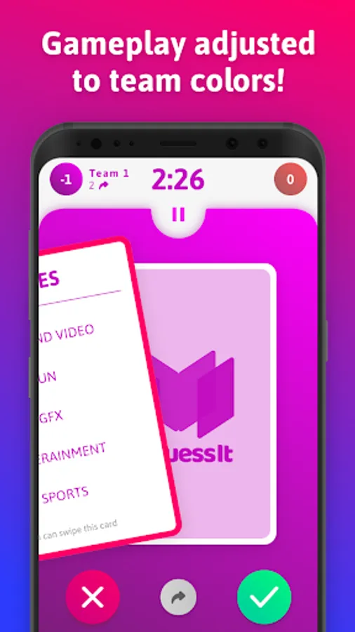 In Guess It, you can use gestures to control cards. When your teammates guessed the word right and you explained it correctly, swipe the card to the right. When something went wrong, swipe the card to the left. To skip the card, swipe it down!