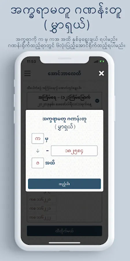 (ခ) အက္ခရာတူဂဏန်းမတူ ထည့်သွင်းရာတွင် အက္ခရာကို က မှ ကအ အထိ တစ်ခုရွေးချယ် ရပါမည်၊ ပြီးလျှင် ဂဏန်းကို ပထမ ၄ လုံးပြည့်အောင်ရိုက်ထည့်ရပါမည်၊ နောက်တွင် ၀၀ မှ ၉၉ မည့်သည့်ဂဏန်းမဆို နှစ်လုံး ထည့်သွင်းလို့ရပါ သည်။