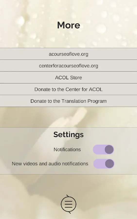 Begin every day with a quotation from A Course of Love — selections which have proven, time and again, to be EXACTLY what is needed to face a challenge and find a deeper truth. ACOL Access is a handy app that provides a daily notification each morning to a key quotation within A Course of Love. It also gives access free chapters within A Course of Love, free audio files narrated by ACOL’s First Receiver Mari Perron, articles inspired by readers of ACOL, and more.
