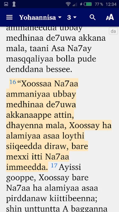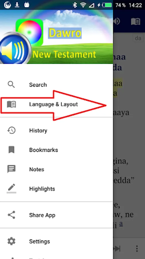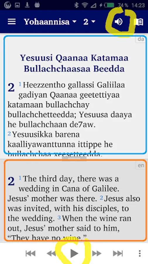 The New Testament in Dawro can also be listened to. If you press the little “da” icon on the top right you can change the windows on the screen: Now choose either