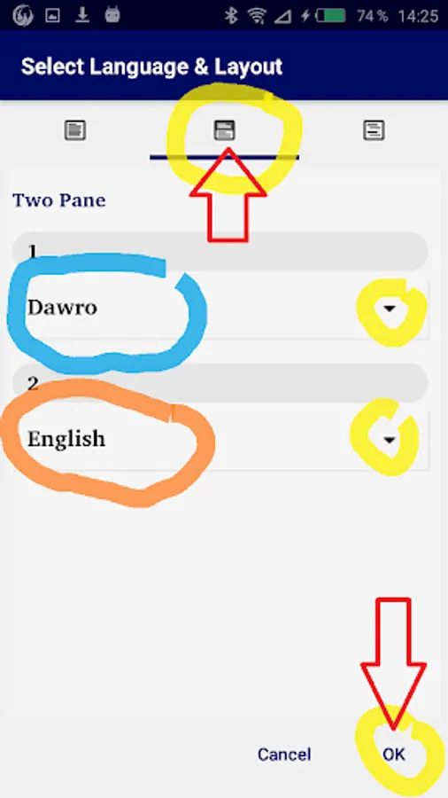 - "two panes" to display the Dawro at the top and the French or English version at the bottom