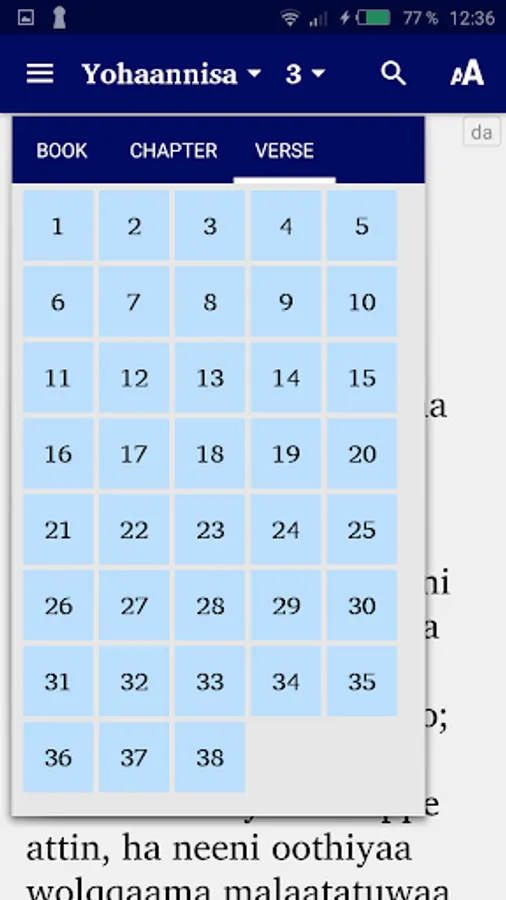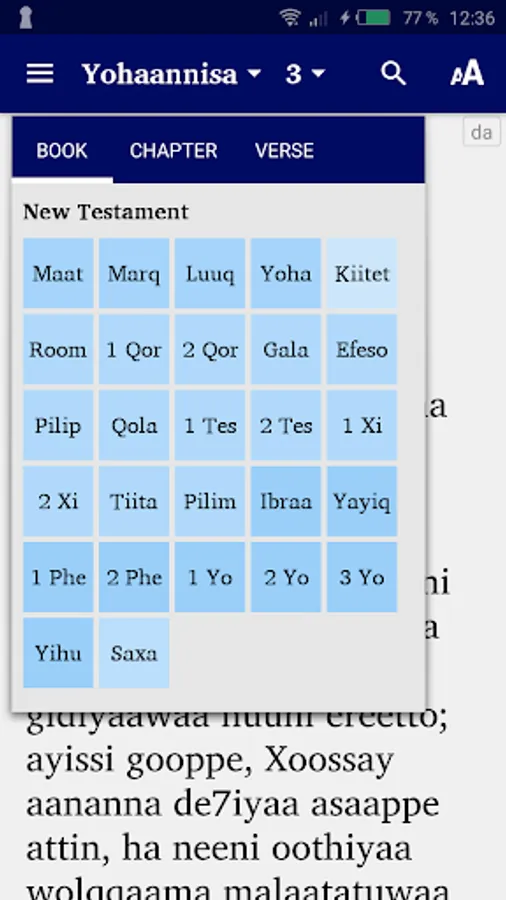 - "verse by verse" to display a verse in Dawro followed by the same verse in French or in English.