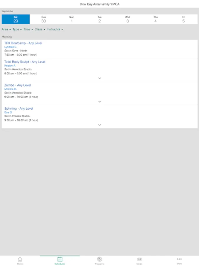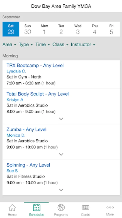 • Easily view schedules for each day and filter for the types of classes that you like.