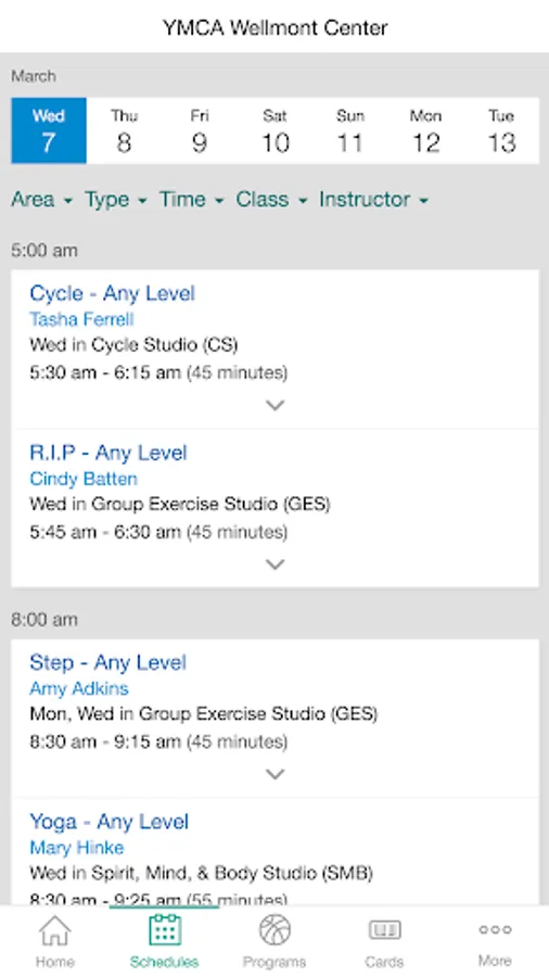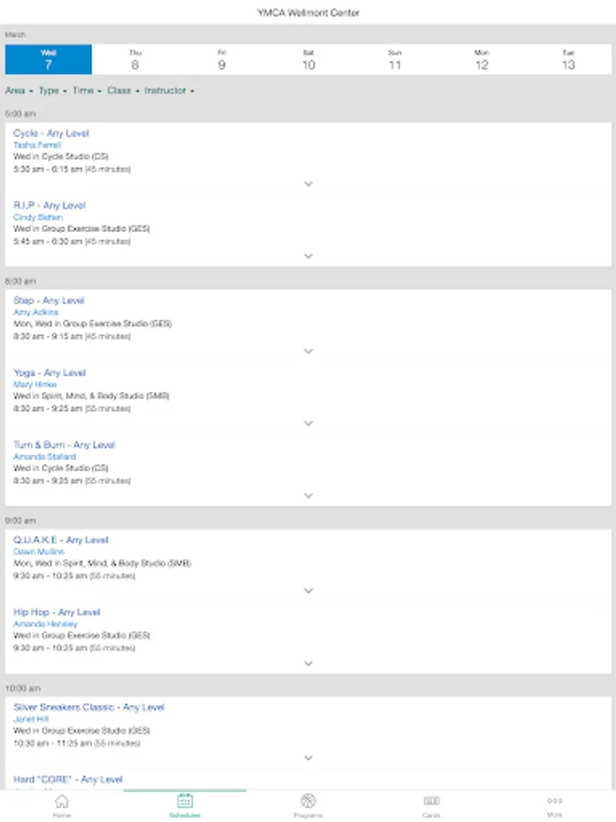 • Easily view schedules for each day and filter for the types of classes that you like.