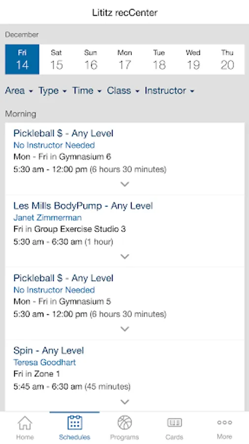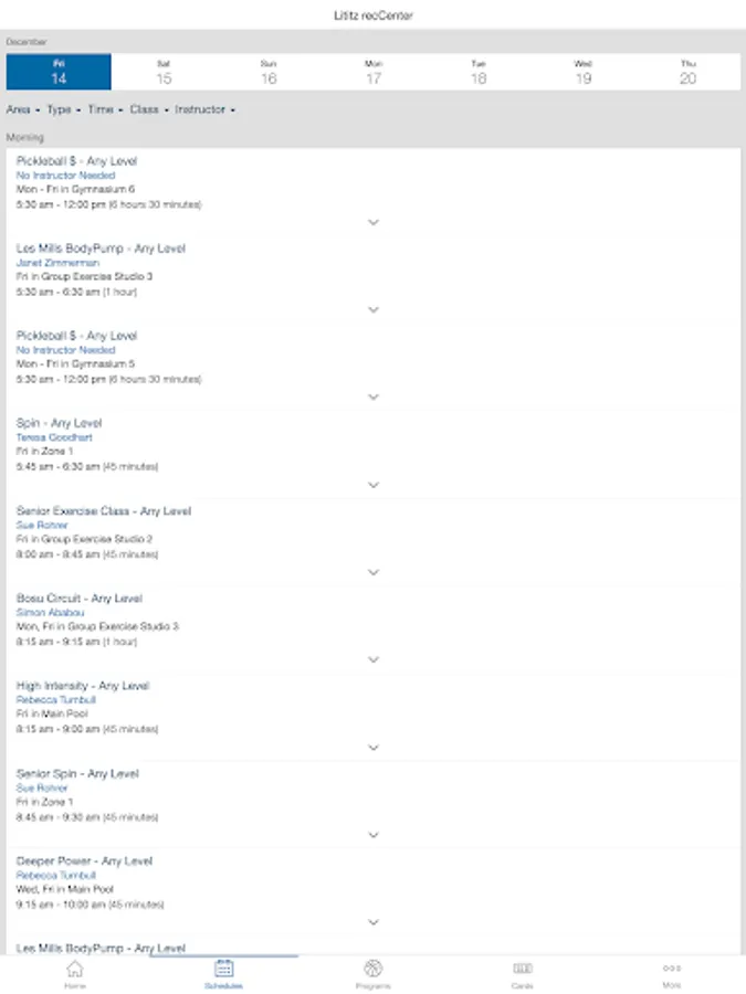 • Easily view schedules for each day and filter for the types of classes that you like.
