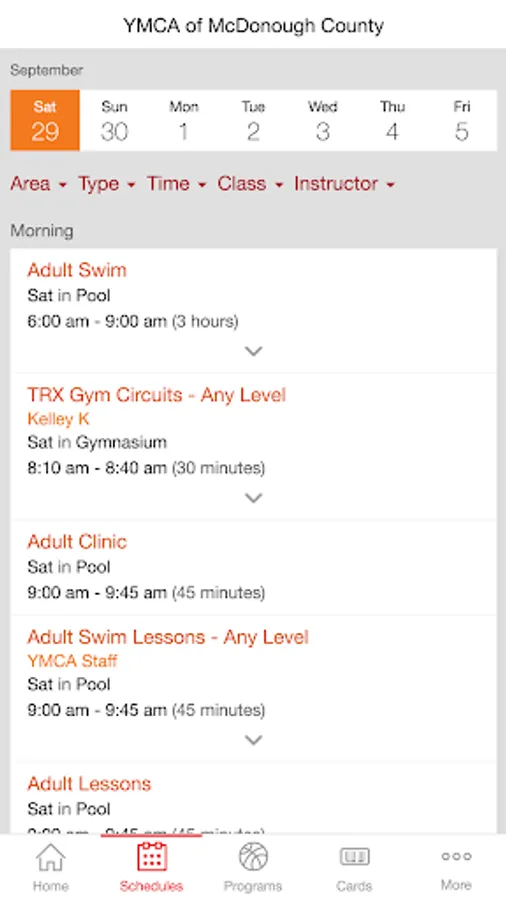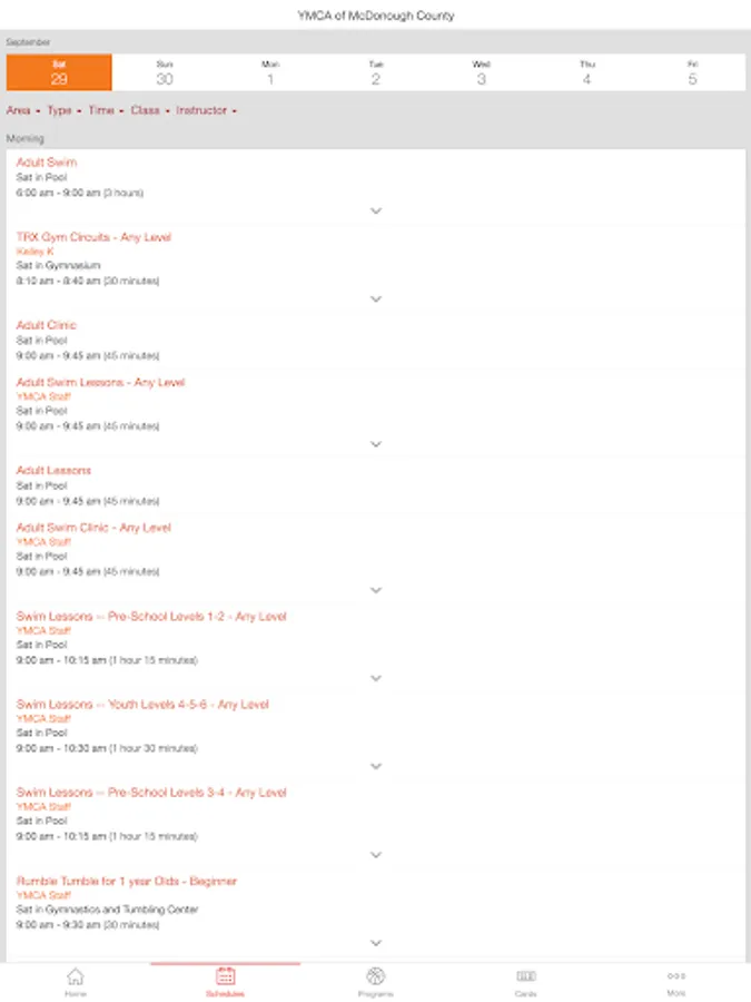 • Easily view schedules for each day and filter for the types of classes that you like.
