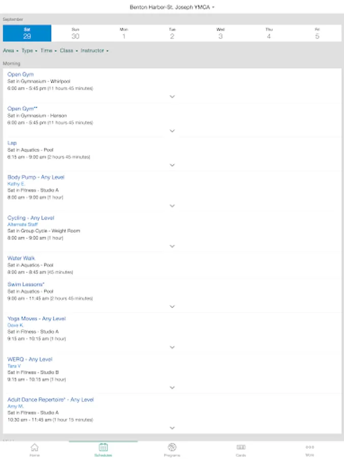 • Easily view schedules for each day and filter for the types of classes that you like.