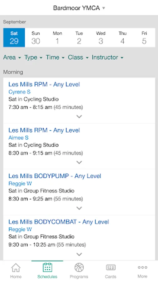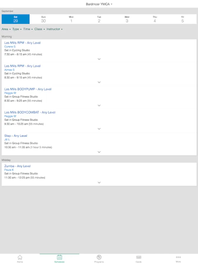 • Easily view schedules for each day and filter for the types of classes that you like.