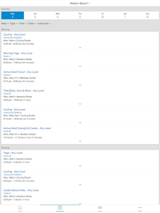 • Easily view schedules for each day and filter for the types of classes that you like.