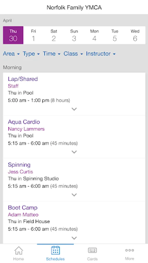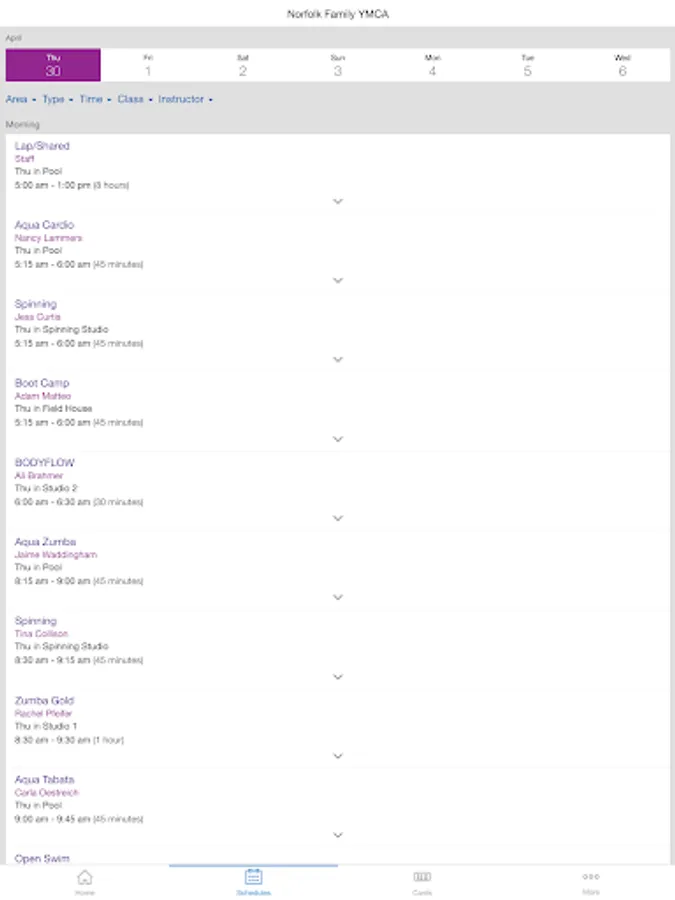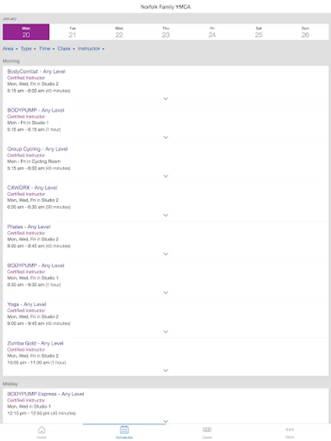 • Easily view schedules for each day and filter for the types of classes that you like.