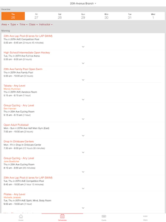 • Easily view schedules for each day and filter for the types of classes that you like.