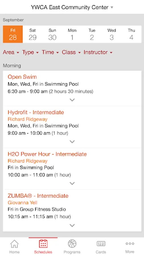 • Easily view schedules for each day and filter for the types of classes that you like.