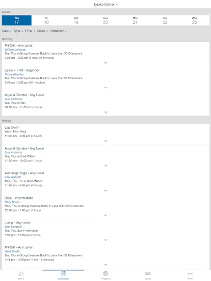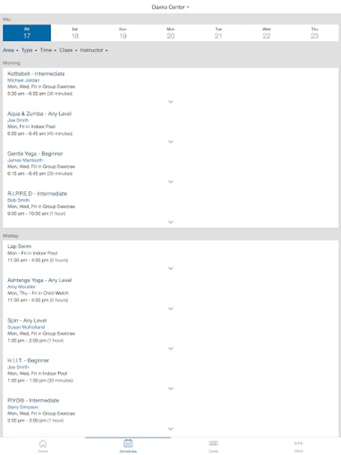 • Easily view schedules for each day and filter for the types of classes that you like.