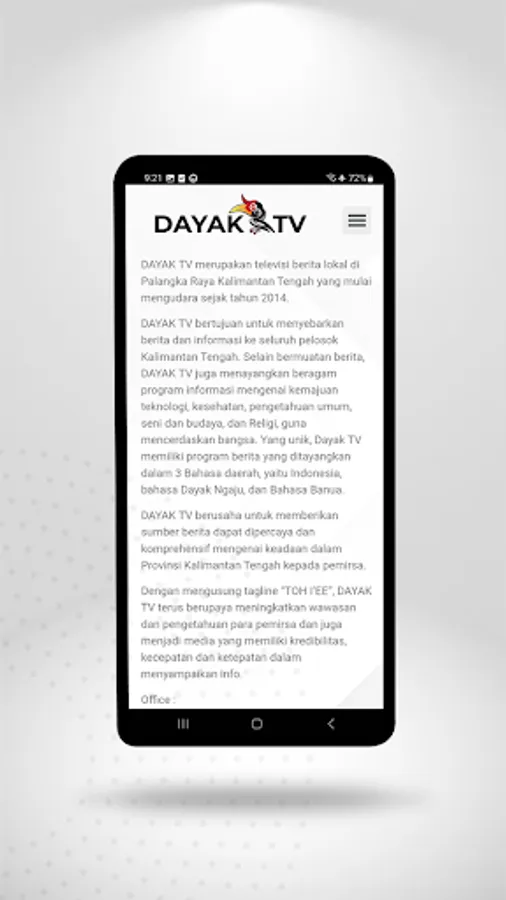 DAYAK TV aims to spread news and information throughout Central Kalimantan. In addition to news, DAYAK TV also broadcasts various information programs on technological progress, health, general knowledge, arts and culture, and religion, to educate the nation. What is unique, Dayak TV has a news program that airs in 3 regional languages, namely Indonesian, Ngaju Dayak language, and Banua Language.