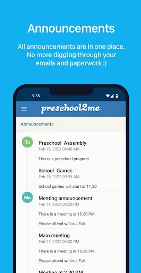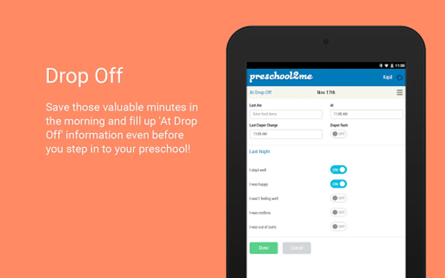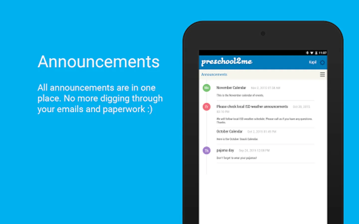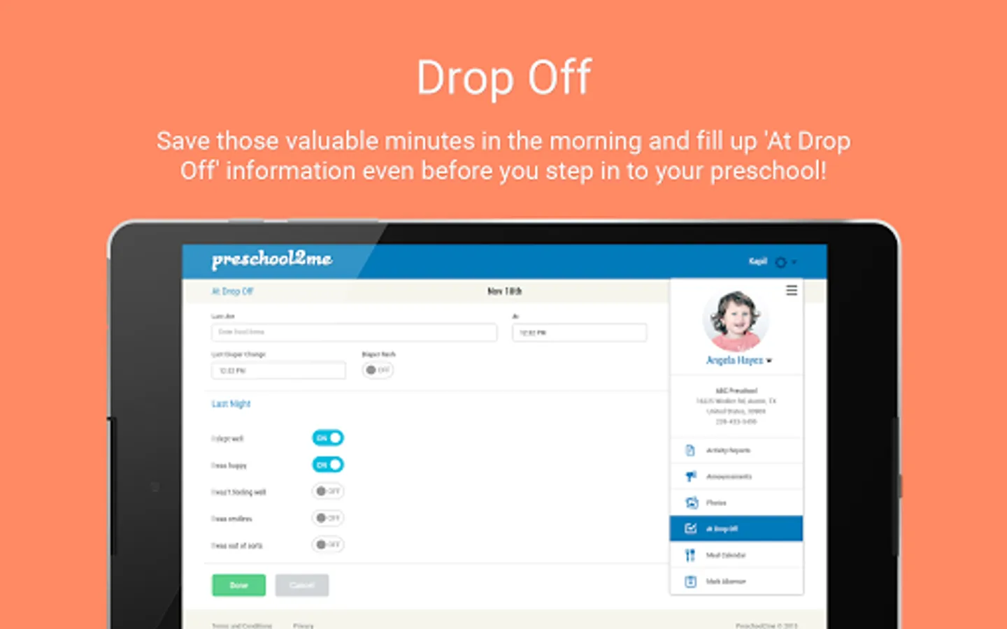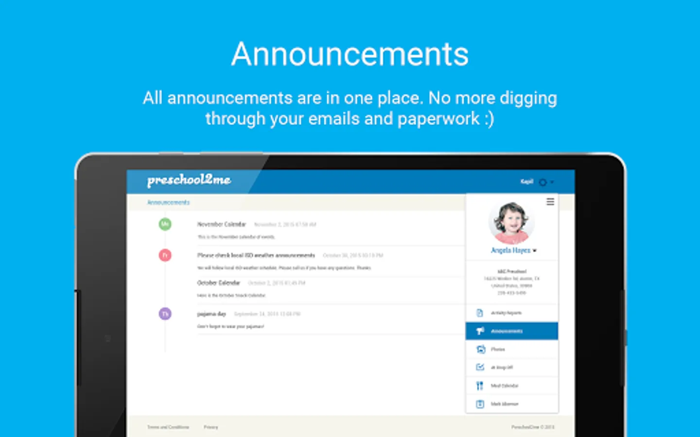 Preschool2me Parent Pro makes it easy for parents to view their child’s pictures, activity reports, announcements sent from the preschool. Parents can even communicate with the preschool by sending At Drop Off and Absence information. No more viewing information just via email. Enjoy the ease of viewing everything you want to know about your child’s day right at your fingertip!