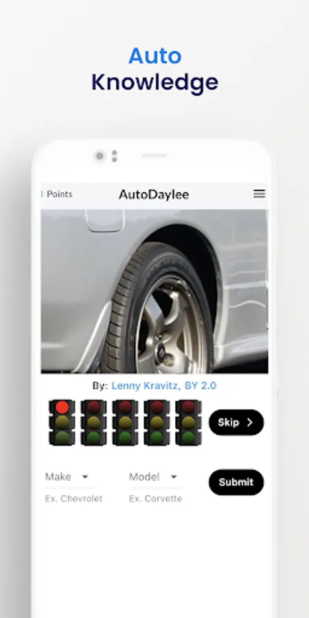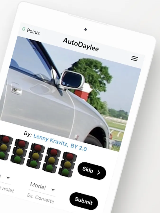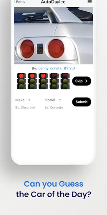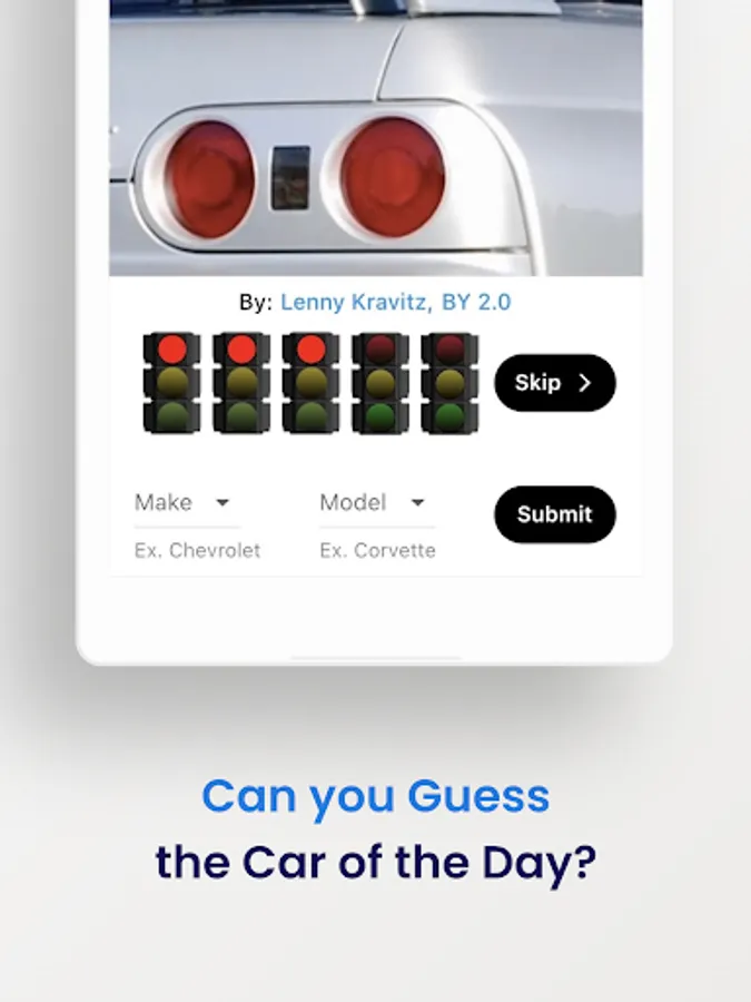 Enjoy a daily auto challenge! Can you guess the car of the day (Make and Model)? You'll get five guesses, each showing a different area of the vehicle. Swipe or tap the red traffic light(s) to see previous image(s). Come compete with friends, share your results, and try to top the leaderboard. Have fun and SHARE your results!