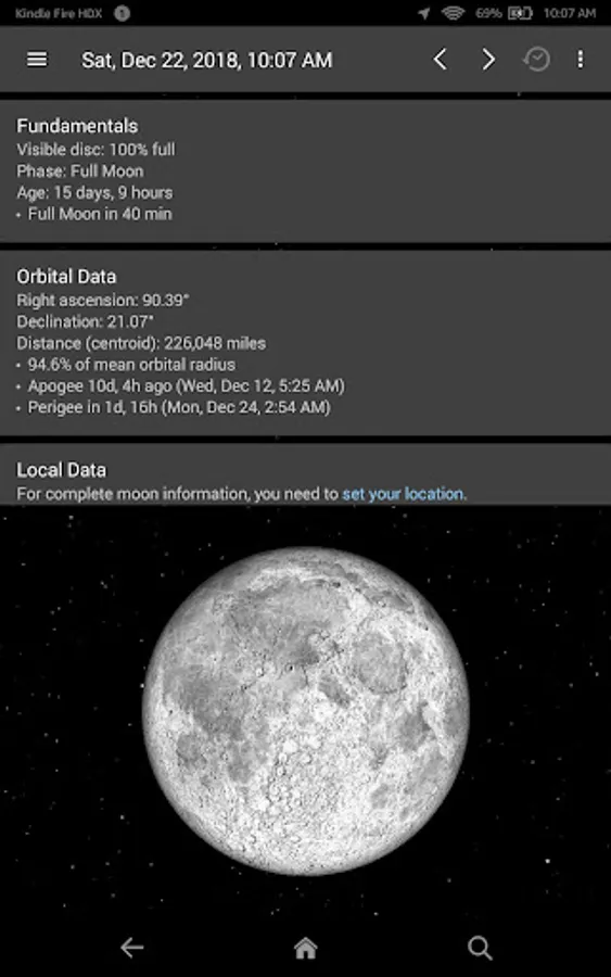Spectacular, interactive 3D simulation of the moon, right down to the shadows in the craters and earthshine on the dark side. Touch screen control changes date and time as seen from your location - the phase tracks your every move. Use two fingers to spin the moon itself (see the far side!) and zoom in to see lunar features up close.