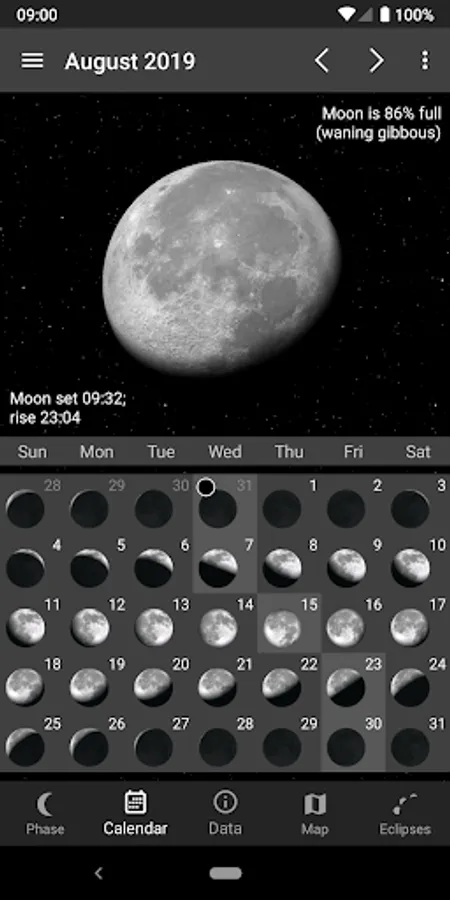 ▶ Lunar Calendar shows month’s phases at a glance
