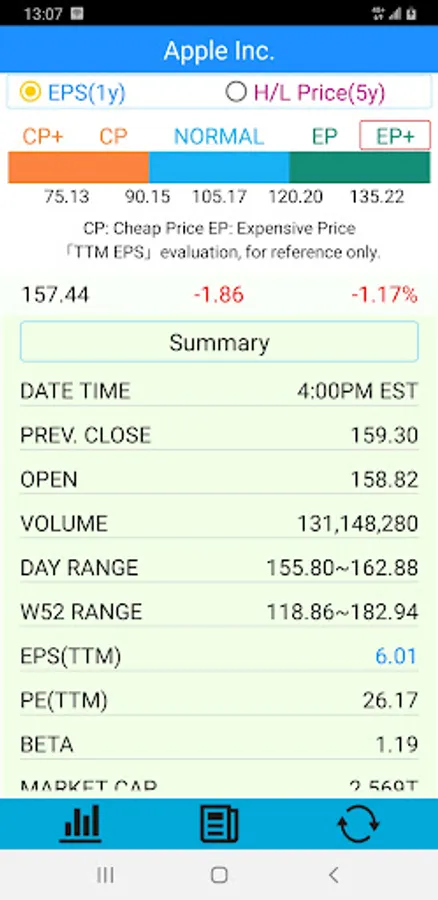 + Stock information: EPS, PE ration, Beta and Shares.