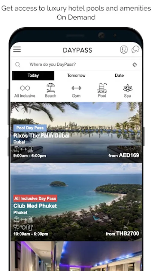 DayPass lets you reserve Hotel & Resort wellness and fitness amenities, Health Clubs and Spas day pass experiences, for the day, on-demand.
