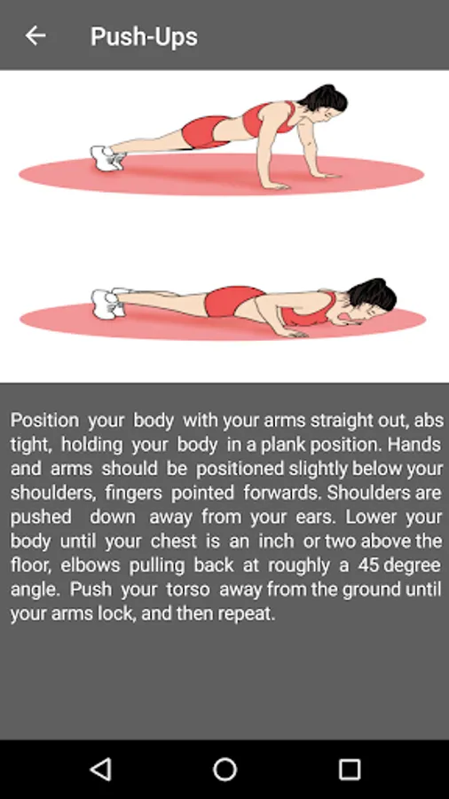 We describe in details the correct way to perform a tricep or bicep exercise. To avoid misunderstanding, we also accompany our instructions with colorful images so our users have no difficulty in performing the correct arms workouts.