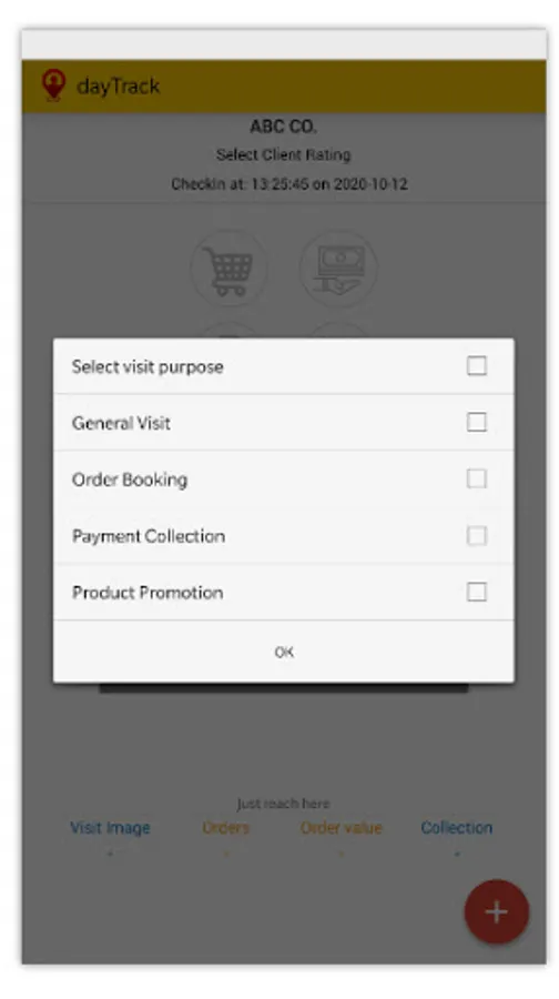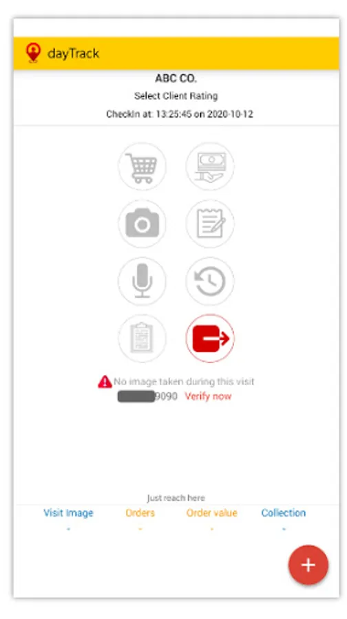- Check-in and Check-out from client visit (Time and GPS Location is mapped)