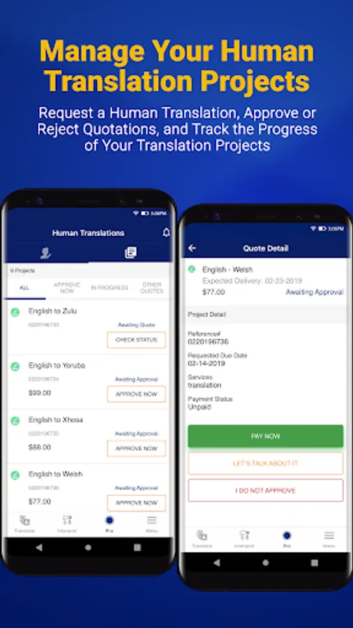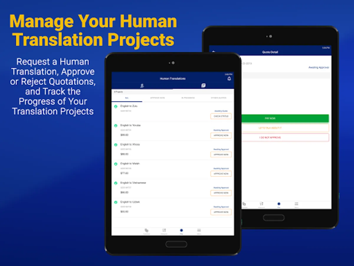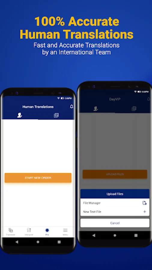 If you need professional Human-Powered Translations for documents or other files, you can order the translations directly from the app using the "Pro" feature. Our app lets you sign up or login within seconds through our “Pro” button so that you may order your professional human-powered translation in a wide variety of file formats.